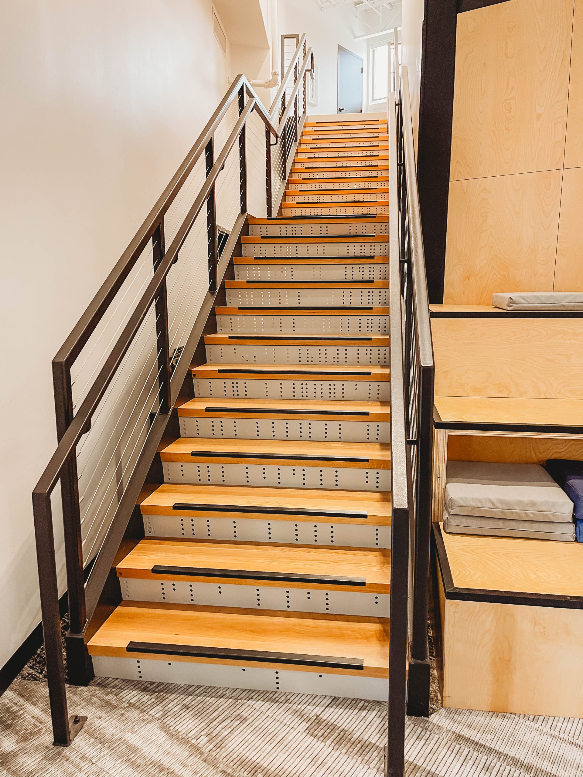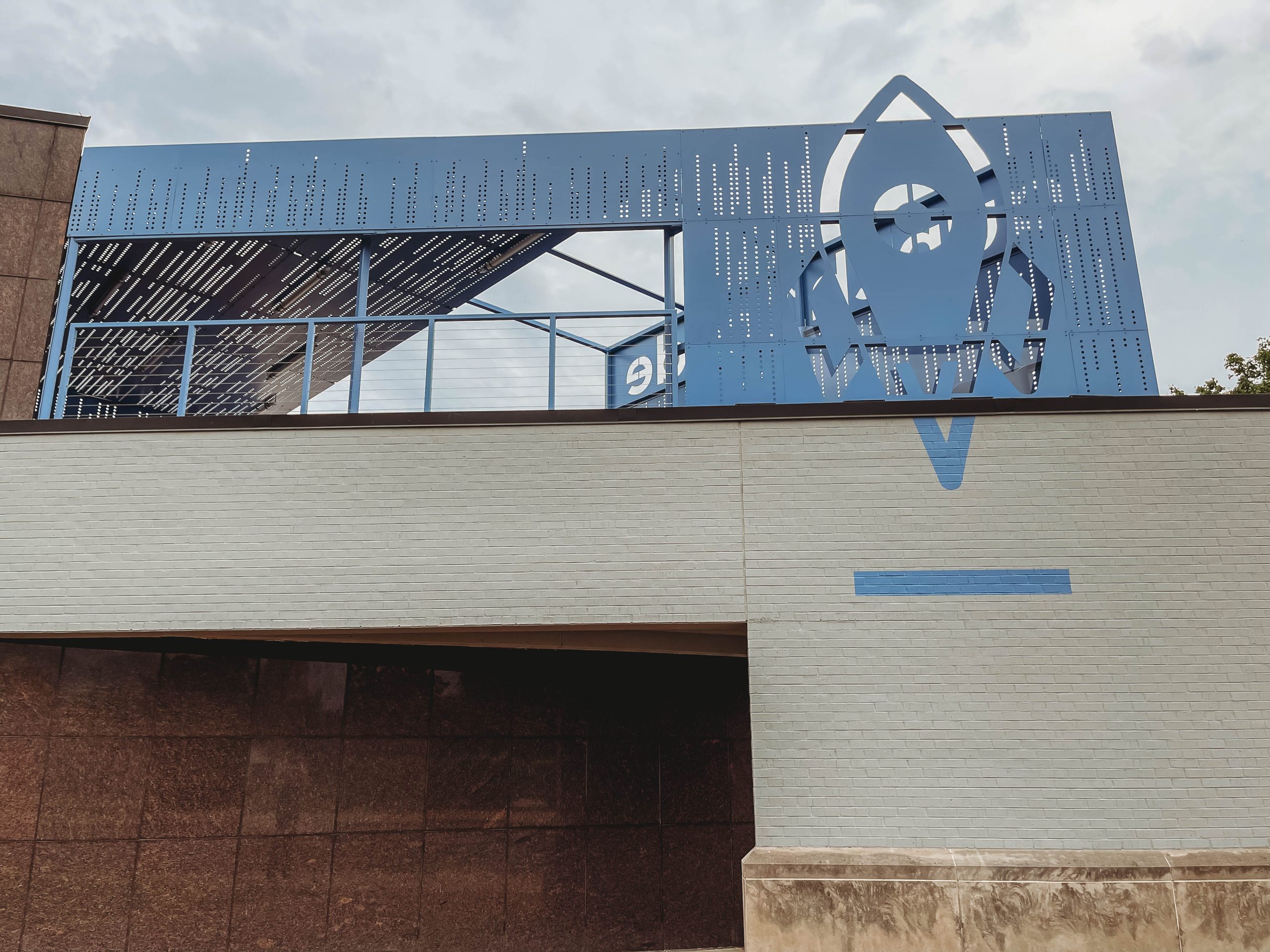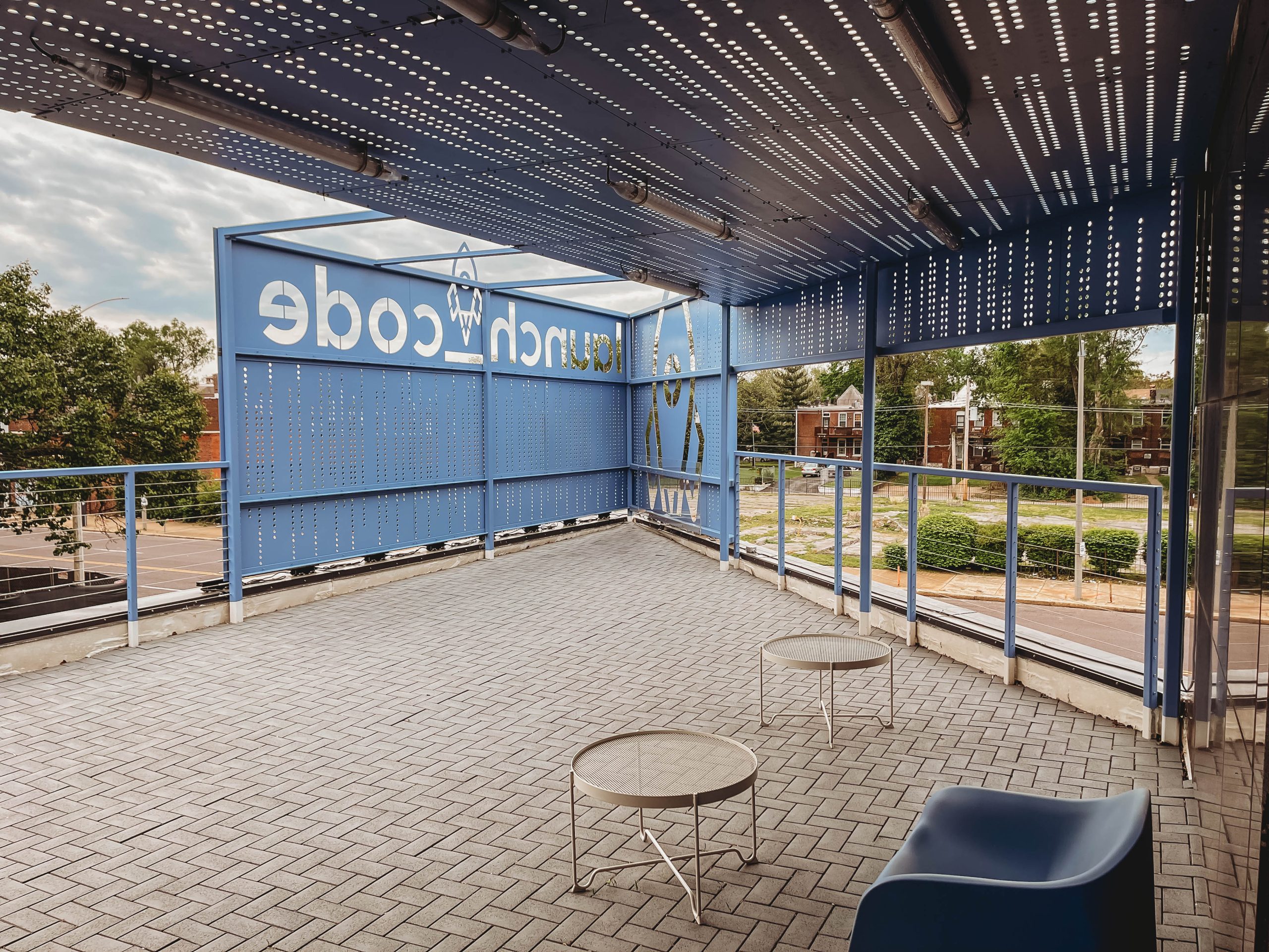 Structural steel mezzanine w/ decorative stairs and stainless cable guardrail, decorative tube steel frame rooftop trellis with custom perforated panels and custom entry canopy w/ decorative custom perforated panel surround.