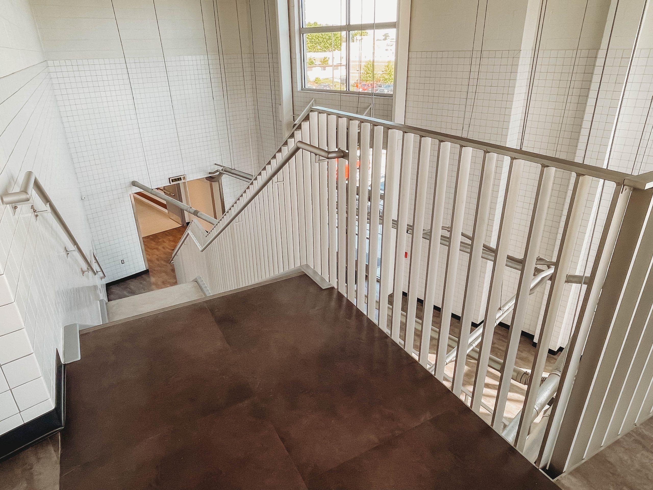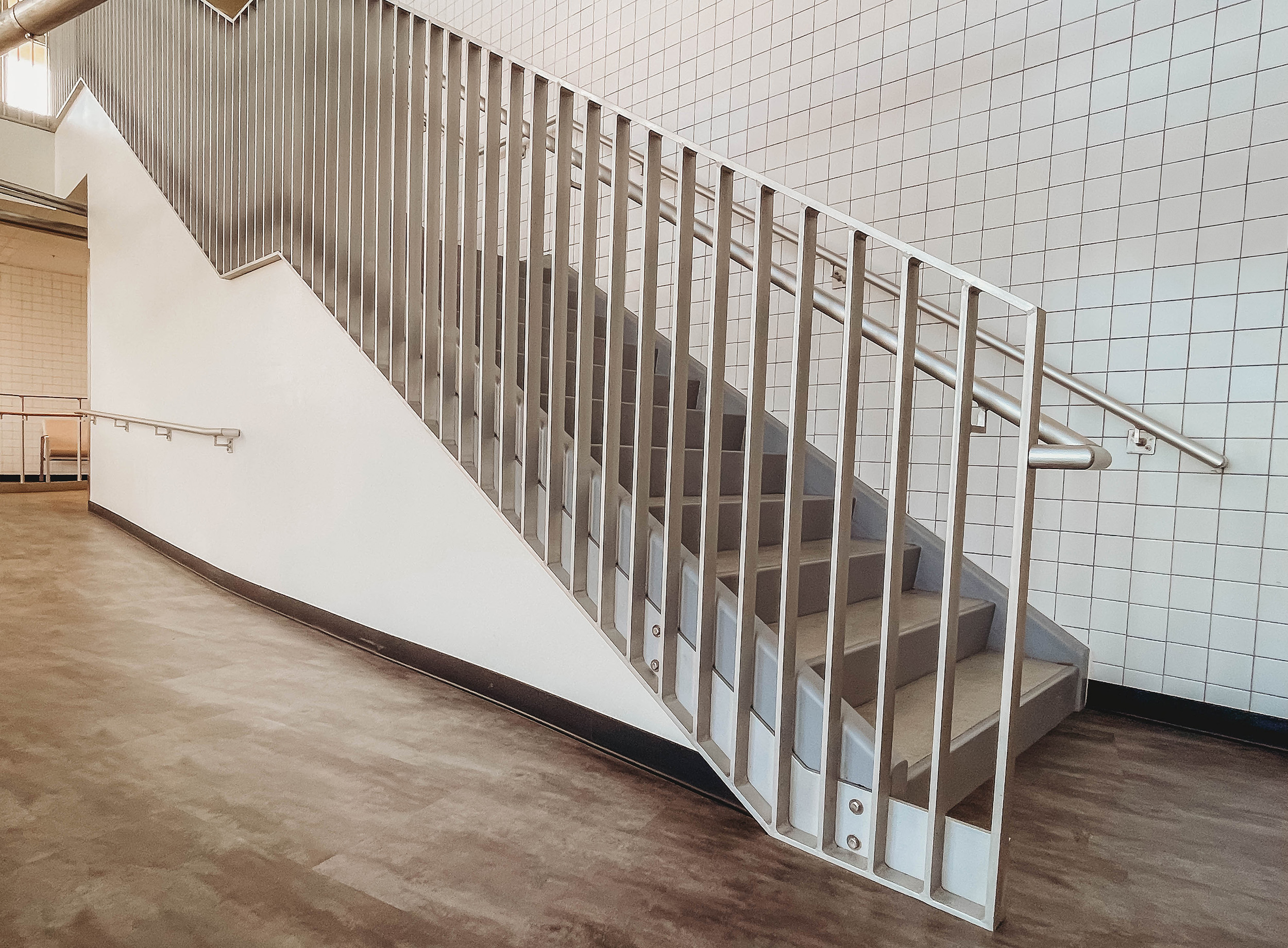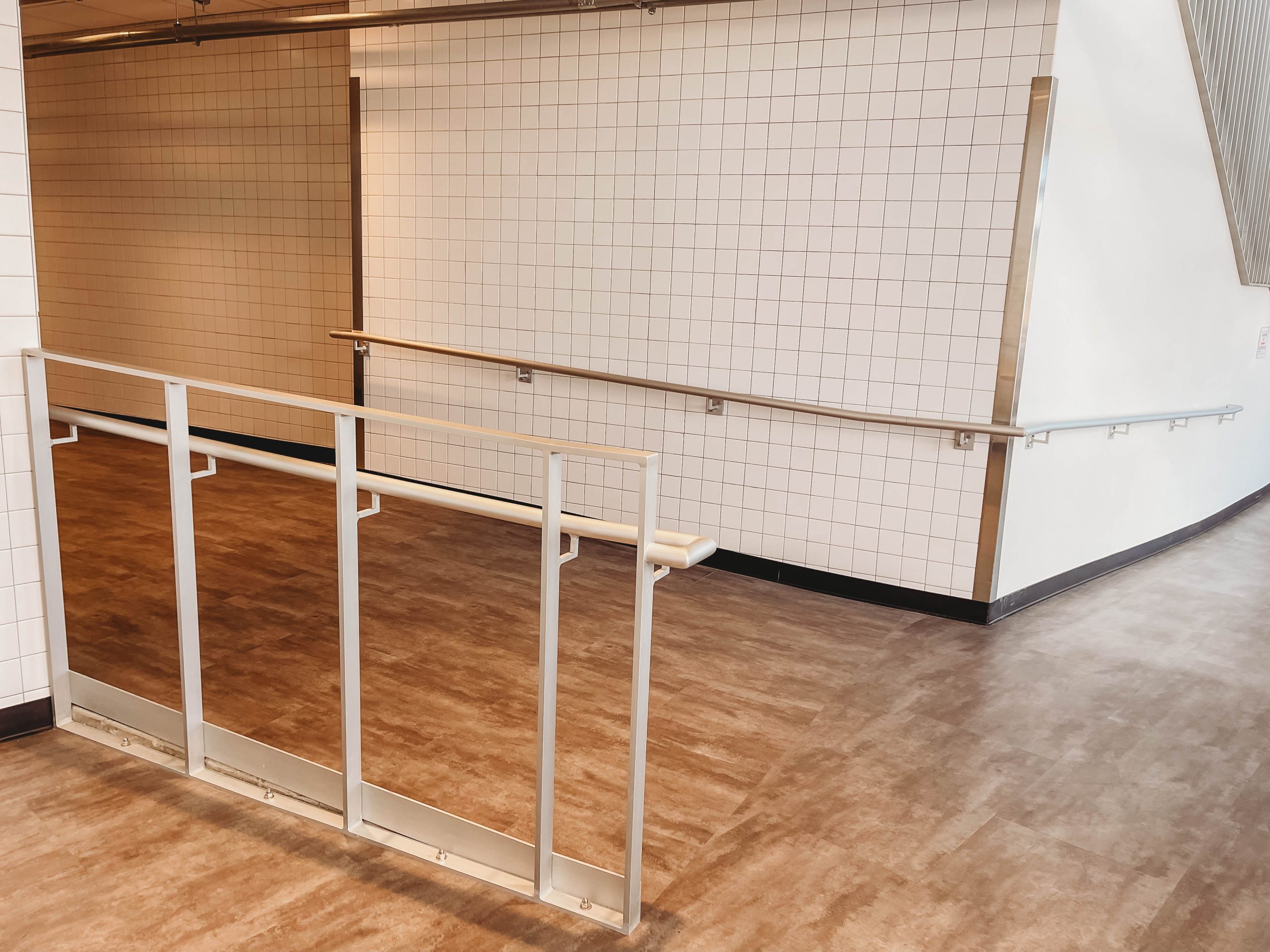 A mixture of wall mounted aluminum rail and decorative aluminum rail with a clear anodized finish for the ADA ramps and stair inside of the building.