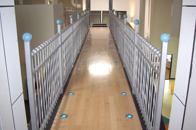 A mixture of wall mounted aluminum rail and decorative aluminum rail with a clear anodized finish for the ADA ramps and stair inside of the building.