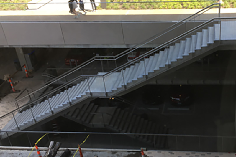 Two-line satin (#4) finished stainless steel bar rail with a vertical cable infill for (5) sets of cast-in-place underground parking garage stairs